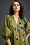 Featuring a green mini dress in cotton base with a v-neckline, puffed sleeves and metallic floral embroidery. Accentuate it with statement earrings and heels for a brunch or an evening look.