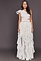 Featuring a white one-shoulder dress in roma and net base with ruffles. It is paired with a matching inner and a sequins belt.