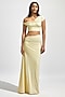 Featuring a butter yellow crop top in malai lycra base with draped shoulder detail. It is paired with a ruched long skirt. Perfect for making a statement at any event.