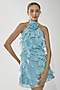 Featuring an ice blue mini ruffled dress in chiffon base with a halter neckline and floral detailing on the collar. Accentuate with statement earrings and heels for a garden party or an evening look.