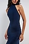 Featuring a navy blue maxi dress in malai lycra base with a high-neckline, low-cut back and ruched detailing. Elevate your style with statement earrings and elegant heels for a glamorous look at any grand events or an evening party.