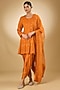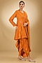 Featuring an orange anarkali in georgette base with aari resham, pearls, sequins and swarovski crystal embroidery. It is paired with modal satin tulip pants and a silk organza dupatta. Accentuate it with delicate jewellery and embellished juttis for an elegant touch, perfect for festive gatherings, weddings and evening celebrations.