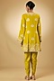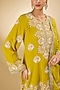 Featuring a yellow short anarkali in georgette base with aari resham, pearls, sequins and swarovski crystal embroidery. It is paired with modal satin tulip pants and a silk organza dupatta. Accentuate it with delicate jewellery and embellished juttis for an elegant touch, perfect for festive gatherings, haldi functions and evening celebrations.