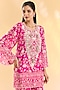 Featuring a rani pink A-line short kurta in crepe base with hand and machine embroidery. It is paired with crepe gharara pants and a georgette stole. Accentuate it with zircon jewellery and heels for a wedding, sangeet or engagement ceremony.