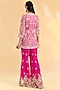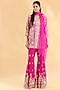 Featuring a rani pink jacket in organza base with hand and machine embroidery. It is paired with georgette sharara pants and an organza stole. Accentuate it with zircon jewellery and heels for a wedding, sangeet or engagement ceremony.
