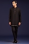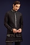 Featuring a black bundi jacket in linen satin base with mirror work, sequins and dori embroidery. It is paired with a cotton silk blend kurta and cotton lycra slim pants. Accentuate it loafers and watch for festive celebrations, wedding or sangeet ceremony.