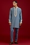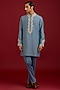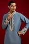 Featuring a light blue kurta in cotton silk blend base with mirror work, sequins and dori embroidery. It is paired with cotton lycra slim pants. Accentuate it loafers and watch for festive celebrations, wedding or sangeet ceremony.