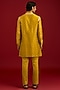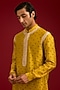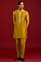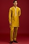 Featuring a mustard kurta in chanderi bandhej base with sequins and dori embroidery. It is paired with cotton lycra slim pants. Accentuate it loafers and watch for festive celebrations, wedding or sangeet ceremony.