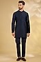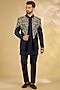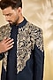 Featuring a navy blue indowestern in cotton silk base. It is paired with a kurta and pants. Style it with mojaris for a wedding, sangeet or engagement ceremony, exuding charm and elegance.