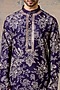 Featuring a navy blue kurta in cotton silk blend base with anchor and detailed patra embroidery. It is paired with a matching printed jacket and onion pink silk pants.