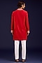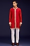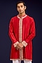 Featuring a red front-open kurta in chanderi base with mirror work, sequins and dori embroidery. It is paired with cotton lycra slim pants. Accentuate it loafers and watch for festive celebrations, wedding or sangeet ceremony.