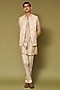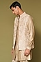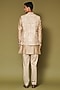 Featuring a sand-colored bundi jacket in linen satin and cotton lycra base with dori jaal embroidery. It is paired with a silk chanderi kurta and pants. Style it with a pair of loafers for a wedding, engagement or sangeet functions.