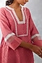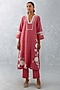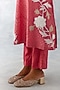 Featuring a rose pink kurta in chanderi and satin base with screen print, lace detailing, thread, and floral embroidery. It is paired with matching shantoon palazzo pants and an organza dupatta.