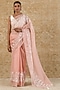 Featuring a water pink saree in silk organza base with hand block floral print, a resham embroidered pallu and lace detailing. It is paired with a matching gajji blouse having fabricated rings detail.