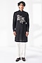 Featuring a black kurta in matka silk base with motif embroidery. It is paired with a pant-style pyjama. Style it with mojaris for a festive occasion, a cultural event, a haldi, a wedding, or an engagement ceremony.