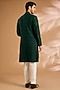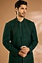 Featuring a bottle green indo-western jacket in silk base. It is paired with pants. Style it with polished black mojaris and a sleek watch for festive events, sangeets, mehendi or evening celebrations.