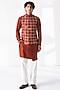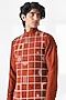 Featuring a burnt orange nehru jacket in silk base with structured grid pattern, concealed placket, motif detailing, and thread embroidery. Style it with a kurta set and mojaris for a festive occasion, sangeet, wedding or engagement ceremony.