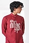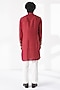 Featuring an earthy red kurta in matka silk base with motif embroidery. It is paired with a pant-style pyjama. Style it with mojaris for a festive occasion, a cultural event, a haldi, a wedding, or an engagement ceremony.