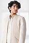 Featuring an ivory front-open sherwani in silk base with vertical pintuck and metal beadwork. It is paired with a cotton silk zipper kurta and a terry cotton pant-style pyjama. Style it with mojaris for a reception, sangeet, wedding or engagement ceremony.