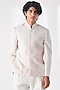 Featuring an ivory classic-cut bandhgala in silk base with concealed placket and thread embroidery. Style it with formal pants and loafers for a reception, sangeet, wedding or engagement ceremony.