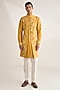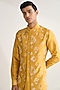 Featuring a marigold kurta in raw silk base with thread embroidery. It is paired with terry cotton pyjama pants. Perfect attire for any festive occasion or sangeet ceremony, exuding traditional charm and timeless elegance.