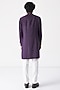 Featuring a midnight purple kurta in cotton silk base with a city skyline motif, thread embroidery, and an asymmetrical layered overlay. It is paired with a pant-style pyjama. Style it with mojaris for a festive occasion, a cultural event, a haldi, a wedding, or an engagement ceremony.