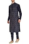 Featuring a navy blue kurta in tissue chanderi base with patch work. It is paired with matching churidar pants.