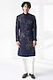 Featuring a navy blue sherwani in silk base with metal beads pattern and hand embroidery. It is paired with a terry cotton pant-style pyjama. Style it with mojaris for a wedding or engagement ceremony.