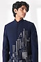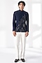 Featuring a navy blue bandhgala in silk base with concealed placket and thread embroidery. Style it with formal pants and loafers for a reception, sangeet, wedding or engagement ceremony.