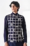 Featuring a navy nehru jacket in silk base with structured grid pattern, concealed placket, motif detailing, and thread embroidery. Style it with a kurta set and mojaris for a festive occasion, sangeet, wedding or engagement ceremony.