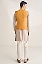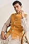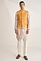 Featuring an ochre bundi jacket in silk base with embroidery. Style it with trousers, for a wedding, engagement or sangeet ceremony, exuding charm and elegance.