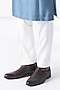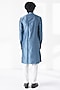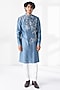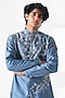 Featuring a storm blue kurta in cotton silk chanderi base with thread embroidery and a mandarin collar. It is paired with a cream pant-style pyjama. Style it with mojaris for a festive occasion, a cultural event, a haldi, a wedding, or an engagement ceremony.