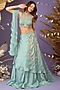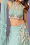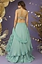 Featuring a dusty mint green draped layered lehenga in satin organza and net base with cutdana, sequins and bead hand embroidery. It is paired with a matching halter neck blouse and a ruffled dupatta.