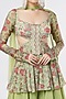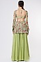 Featuring a lime green cutout peplum top in crepe base with floral print and sequins hand embroidery. It is paired with matching organza sharara pants and a ruffled dupatta.