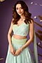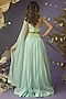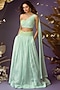Featuring a misty aqua pleated lehenga in satin organza and crepe base with an attached embroidered waist belt. It is paired with a matching draped one-shoulder blouse having cutdana, sequins and beads hand embellishment.
