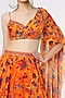 Featuring an orange skirt in organza and crepe base with thigh slit, floral print and sequins embroidery. It is paired with a matching pleated and draped top.