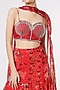 Featuring a red layered lehenga in organza and slub silk base with floral print. It is paired with a matching corset hand embroidered blouse and a printed ruffle dupatta.