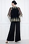 Featuring a black jumpsuit in cotton satin base with gold kasab machine embroidery, including pearl and feather tassels. It is paired with a matching net draped kaftan top.