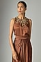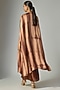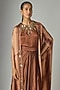 Featuring a brown tie-dye cape in blended satin base with embellishments. It is paired with an embroidered top and draped slit skirt. Accentuate it with stud earrings, a clutch and metallic heels for a cocktail, dinners or evening soirees.