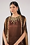 Featuring a brown tie-dye cape in blended satin base with embellishments. It is paired with a top and a draped skirt. Style it with a statement earrings and heels, perfect for a festive occasion, cocktail or sangeet ceremony.
