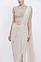 Featuring a champagne blouse in net, polyester satin and blended georgette base. It is paired with a pre-stitched saree. Accentuate it with diamond jewellery, low bun and embellished heels for a cocktail, reception, wedding, sangeet or engagement ceremony.