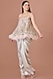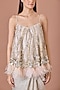 Featuring an champagne camisole in net base with spaghetti straps, sequins and feather hand embroidery. Accentuate with a skirt, dangler earrings and heels for an evening look.