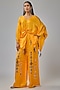 Featuring chrome yellow trousers in blended satin base with mirror and cutdana embroidery. Accentuate it with a kaftan, dangler earrings and mules for festive gatherings or haldi ceremony.