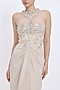 Featuring a cream halter-neck gown in net, lace, polyester satin, stretch lycra, blended shimmer and chiffon base with jewel necklace and parsi gara floral detailing. Accentuate it with diamond statement jewellery, a sleek clutch, and high heels for a complete look, perfect for a cocktail, reception or an after party.