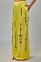 Featuring lemon yellow trousers in blended satin base with mirror and cutdana embroidery. Accentuate it with a kaftan, dangler earrings and mules for festive gatherings or pooja ceremony.