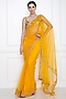 Featuring a marigold saree in net and polyester satin base with embellishments. It is paired with a matching petticoat.