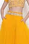 Featuring a marigold skirt in net and viscose georgette base with diamond and pearls embellished waistband. This contains only one piece.