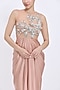 Featuring a nude draped gown in blended satin, net and polyester satin base with hand embroidery. Accentuate it with diamond dangler earrings and heels for a cocktail, reception or evening party.