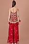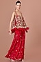 Featuring red sharara pants in blended satin and blended georgette base with sequins and feather hand embroidery, including high-side slits. Accentuate it with a top, dangler earrings and heels for an evening look.
