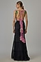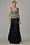 Featuring a black top in silk and georgette base with multi-colored hand and machine embroidery. It is paired with tiered sharara pants. Accentuate it with statement earrings and heels for festive or sangeet ceremonies.